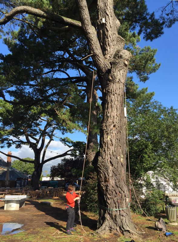 Probably the most outrageous cache placement I can recall having seen 🙂. A tree climb, requiring climbing equipment, in a large and very beautiful, but also very busy pub beer garden.