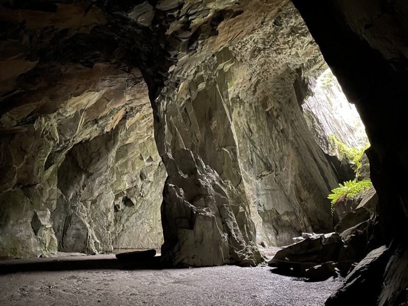 A massive cavern in a disused slate quarry - an awesome location for the cache 🙂.